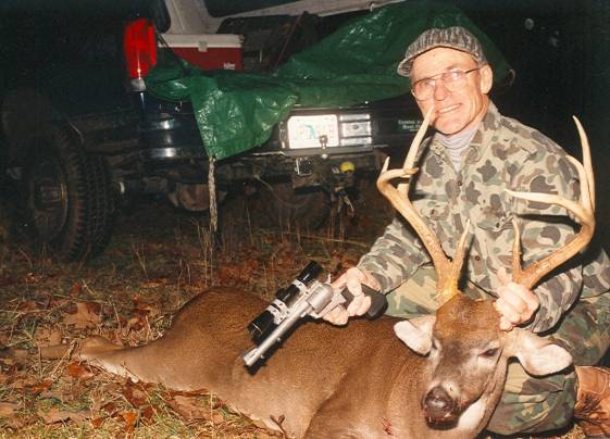 I took a deep breath and raised my Freedom Arms 454 casull, turning to shoot behind my left shoulder. There he was. The big 8pt was sneaking away through an opening behind me. The 300Gr Hornady XTP pushed by 32 Grs of W296 entered his left side on a quartering away angle, exiting just in front of his right leg. He was down on the spot, 45 yards away. My heart was pounding, and I was really shaking as I tried to remain prepared for a second shot, should one be needed.