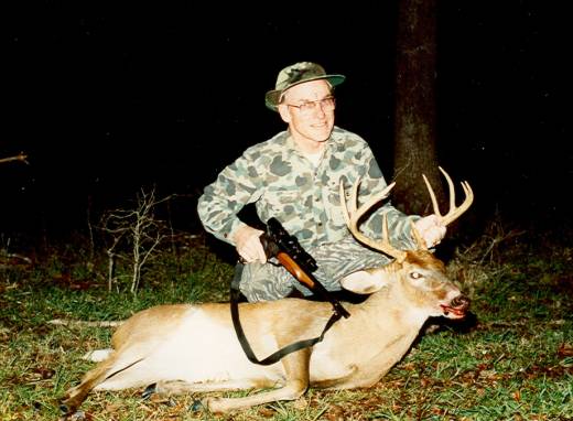 I hung my climber on a pine in a small grove of oaks. The ground sloped down to a very small, steep sided creek then back up a pretty hillside covered with hardwoods. In past years, I had some success with both turkeys and deer on that hillside. This time I was out to christen my Freedom Arms 454 Casull, which was loaded with 300gr Hornady XTPs over 32grs of W296 powder with CCI small rifle magnum primers. At 4:30PM, a very nice 8 pt buck walked along the opposite side of the creek. He stepped down into the creek bed and moved to within 45 yards. As he climbed out of the creek, he heard the distinctive click of the Freedom Arms revolver as I cocked the hammer, and he stopped. The shot bowled him over and he fell back into the creek. He struggled in an effort to regain his feet. Wanting to end his suffering quickly and also to prevent his recovering to run, I shot again. The bank of the creek interfered, and I fired a third shot. All that noise brought Mike to ask what war he was missing. Then he photographed me with my 8pt and newly christened revolver. That made 3 handguns christened with 10, 9, & 8pt bucks. I was beginning to believe that all I had to do to get a trophy buck was to buy a new gun. Try convincing your wife of that!