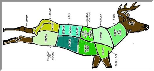 The first step is to saw the carcass down the center of the backbone, dividing it into two sides. If the neck is to be used for a pot roast, it should be removed before the carcass is split. Place the sides of venison inside down on a table and cut according to the chart. Trim excess bone and gristle and further cut meat into family-size packages.