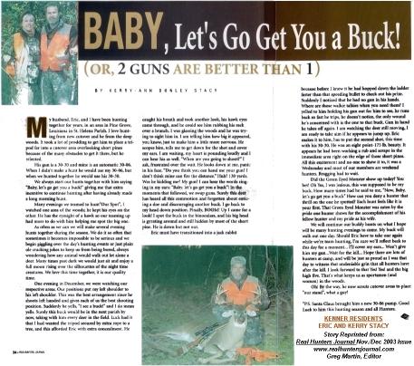One evening in December, we were watching our respective areas. Our positions put my left shoulder to his left shoulder. This was the best arrangement since he shoots left handed and gives each of us the best shooting position. Suddenly he yells "I see a buck!" and I mean yells, surely this buck would be in the next parish by now, taking with him every deer in the field. Luck had it that I wanted the tripod secured by extra rope to a tree, this afforded Eric with extra concealment. He caught his breath and took another look, his hawk eyes came through, and he could see him rubbing his rack over a branch. I was glassing the woods and he was trying to sight him in. I am telling him how big it appeared, you know, just to make him a little more nervous. He scopes him, tells me to get down for the shot and cover my ears. I am waiting, my heart is pounding loudly and I can hear his as well. When are you going to shoot I ask, frustrated over the wait. He looks down at me, panic in his face. Do you think you can hand me your gun? I don’t think mine can fire the distance (130 yards). Huh? Was he kidding me? My gun? I can hear the words ringing in my ears: "Baby, Let’s Go Get You a Buck"! In the moments that followed, we swap guns. Surely this deer has heard all this commotion and forgotten about enticing a doe and discouraging another buck. I go back to my head down position. FINALLY, boom! Up I came for a look! I spot the buck in the binoculars, and his big head is gyrating around and still hidden by most of the short pine. He is down but not out.